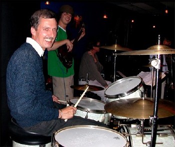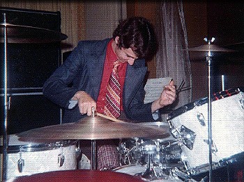 Inevitably, part of the show band routine included Top 40 dance music. I was playing very loudly, (with earplugs) in a plexiglass "aquarium" to isolate the sound, and triggering a drum machine with transducers attached to the drums. (Age 28) ...It was a drag.