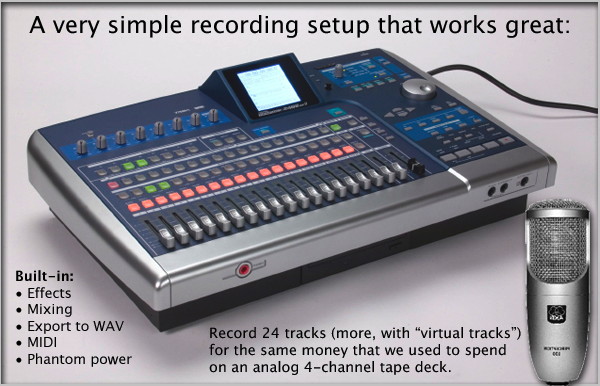 So, use recording equipment that has as many tracks as you need, with a few extras, just in case. If you don't have many tracks available, create a "board mix" from your PA mixer, and combine that onto a separate track. In my case, I chose a Tascam 2488mkII, and a single AKG "Perception 100" (phantom-powered) microphone, to start. All of the "Guest Artist" recordings on my Latest Recordings page were made with this simple setup, and the quality is quite good, even when the original 24-bit WAV files were converted to MP3's for the web. (photo at the top of this page)