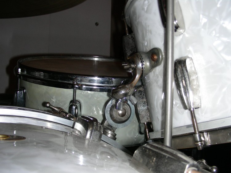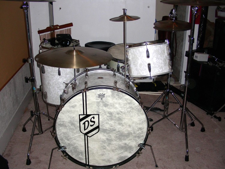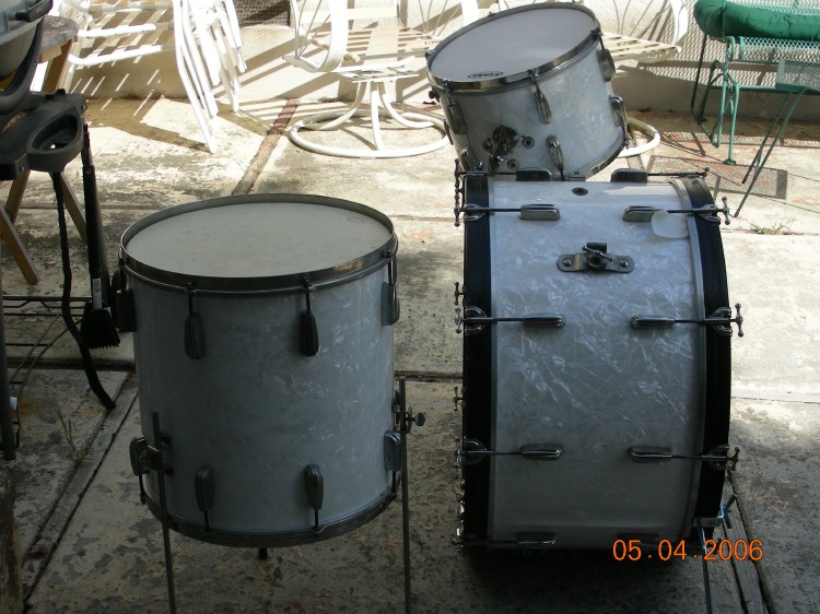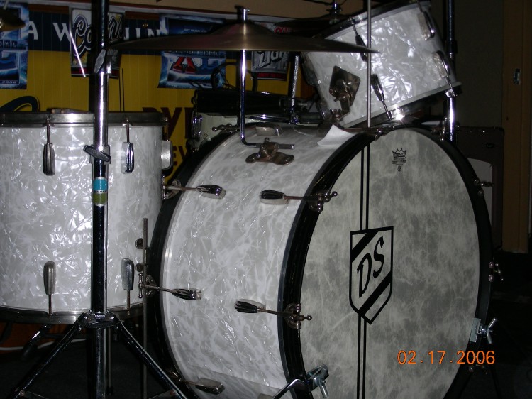 Sizes are 14" x 26" bass drum, 9" x 13" mounted tom, 2 16" x 16" floor toms, and a 51/2" x 14" snare. The snare is from I believe,1955 ("Soundking" lugs) Based on the bass drum badge I'd say its late 40's early fifties. Beavertail lugs.Continental wrap. Ive used the leedy tom mount(like what Buddy used on his last set), a Ludwig hoop mount and now Im using the Slingerland type like what Gene Krupa used.