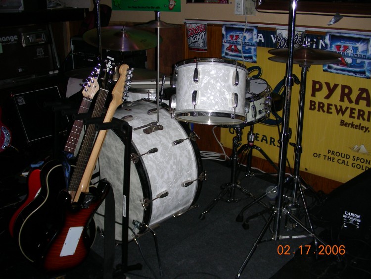 Im using the Ludwig Hercules cymbal stands. Cymbals are 14" Paiste 2002 Heavy Hi-Hat,20" and18" Paiste Rude Crashes, a 8" Zildjian splash, 22" Zildjian Ping Ride and a 22" Zildjian Swish Knocker w/rivets. My pedal is a Rogers, and the bass drum spurs are from Danmar. I try to use Aquarian "American Vintage" heads because I love that warm brown sound they make. The front logo on my bass drum (which uses a Remo "Fiberskyn" head) is from Vintage Logos.