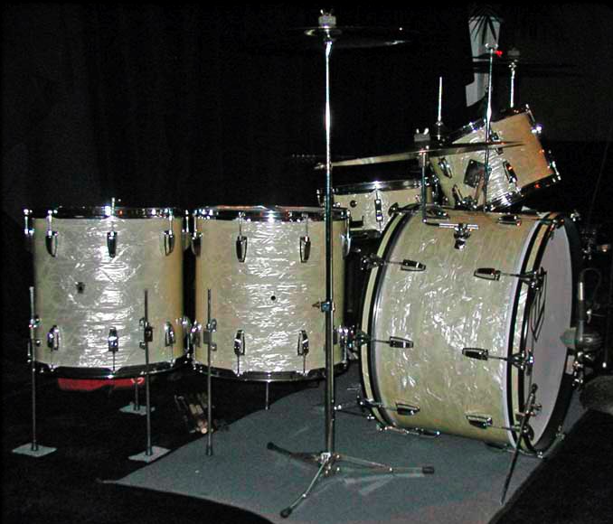 This kit is COMPLETELY ORIGINAL with all original hardware. The WMP has little to no fade. I bought these from a guy who got them from an old jazz drummer that played around Boston MA. The interesting thing is: He NEVER took these drums out of his house! They were purchased as a practice kit. This is the main reason that the WMP is so pristine. This kit is made all the more rare by the fact that it has DUAL 14X14 floor toms. A kit in the true BR configuration. Here are the sizes:
