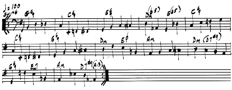 Notice how the bass often uses the upper chromatic substitute to draw attention to each 2-5 sequence.