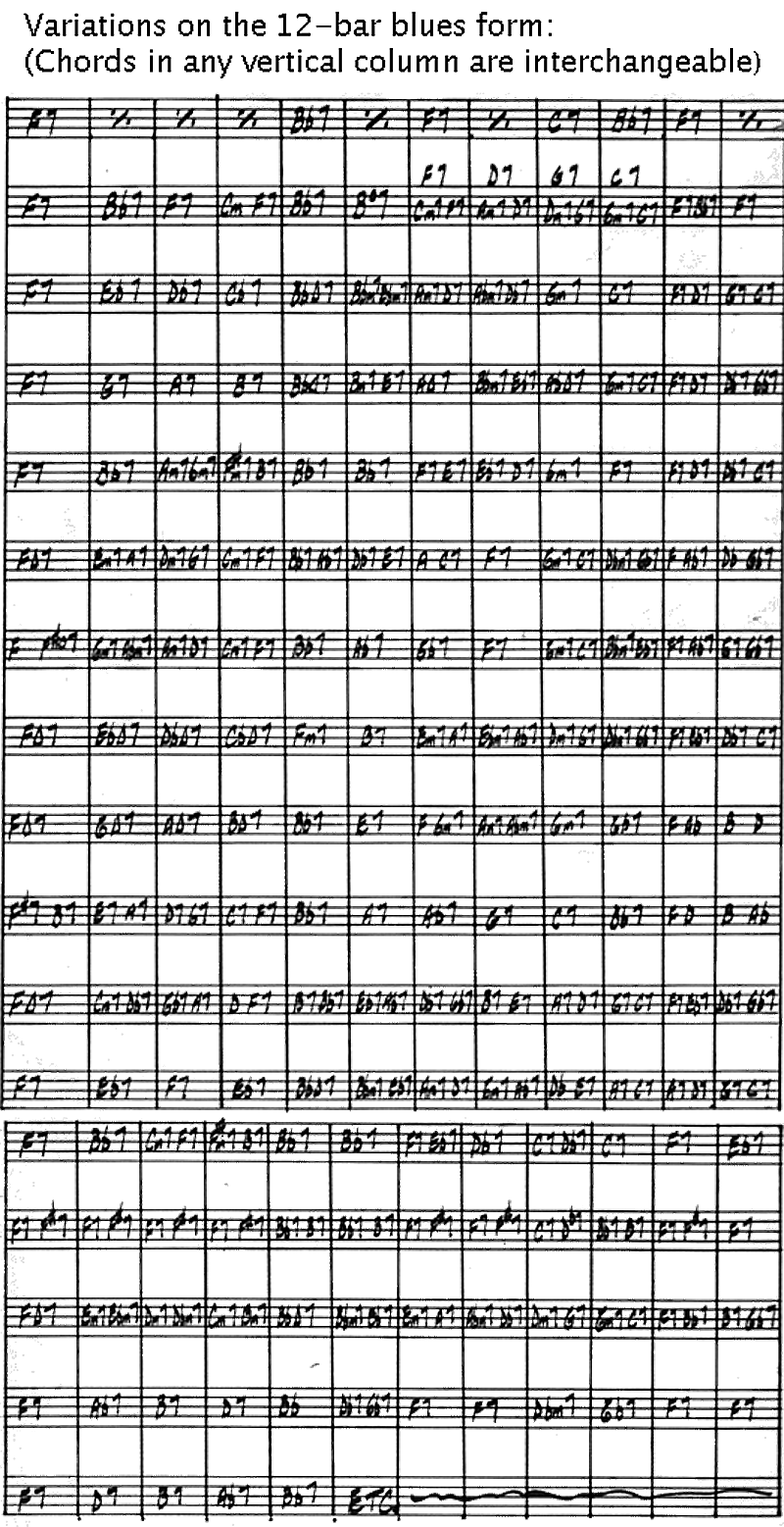 An example of how the "rules" above can affect a simple 12-bar blues: (bass part shown)